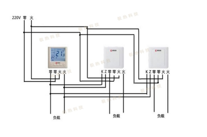 接線方法:溫控器的輸出端口“火”、“零”,分別引出0.75平方以上的電線,接入D02/03型輸出模塊的控制“KZ”端子上。輸出模塊的進線火線接于輸出模塊的“L”上,進線零線接于輸出模塊的“N2”上。負載線直接接于N1和H上。當需要多個輸出模塊同時使用時,可再由第二個負載模塊的NI點和H點直接接入下一級輸出模塊的控制“KZ”端子上。